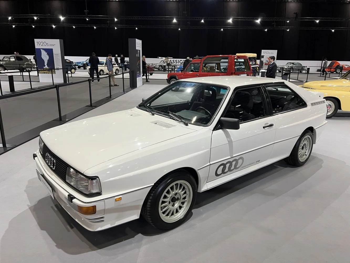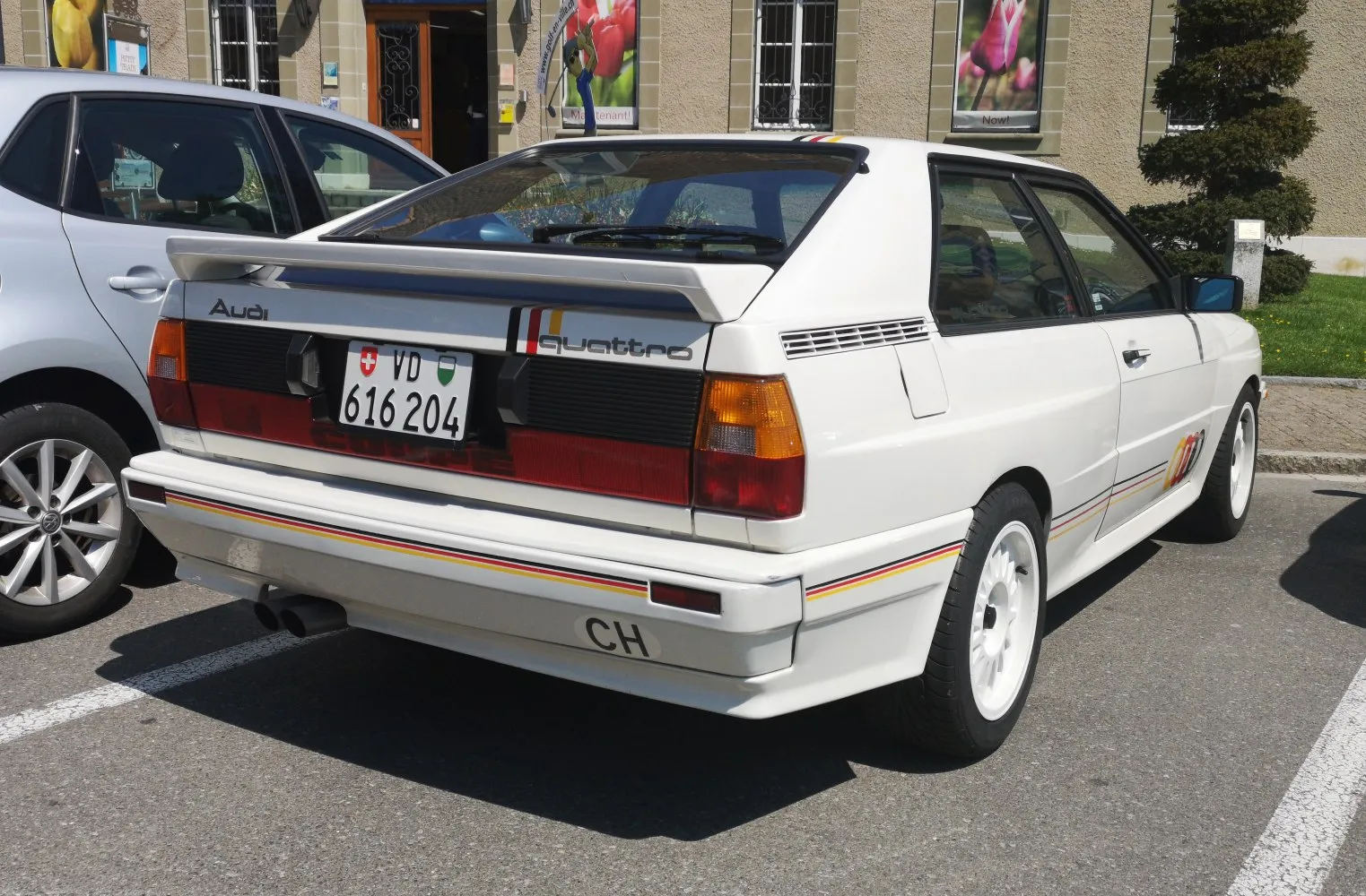 The Audi Quattro is a road and rally car, produced by the German automobile manufacturer Audi, part of the Volkswagen Group. It was first shown at the 1980 Geneva Motor Show on 3 March. Production continued through 1991.